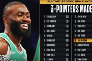 杰伦·布朗本场命中了他生涯季后赛的第268记三分,超越比卢普斯独居历史第16位。距离皮尔斯的276个还差8个。