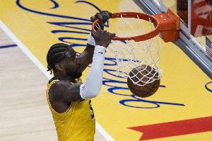 上半场,湖人中锋艾顿送出一次空接暴扣,打了19分钟4投1中,拿到2分2篮板1助攻,正负值-7全队最低。